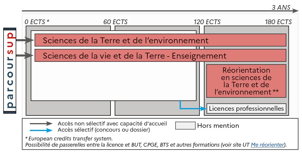- En 3e année : accès sur dossier en parcours STE er SVT-E pour d'autres bac+2 (autres licences scientifiques, CPGE); accès sur dossier en parcours RéoSTE pour les étudiants qui n'ont pas reçu d'enseignement préalable en Sciences de la Terre et de l'environnement et les titulaires d'un BUT, BTS ou CPGE, autres L2, titulaires d'une L3 Sciences de la Vie.